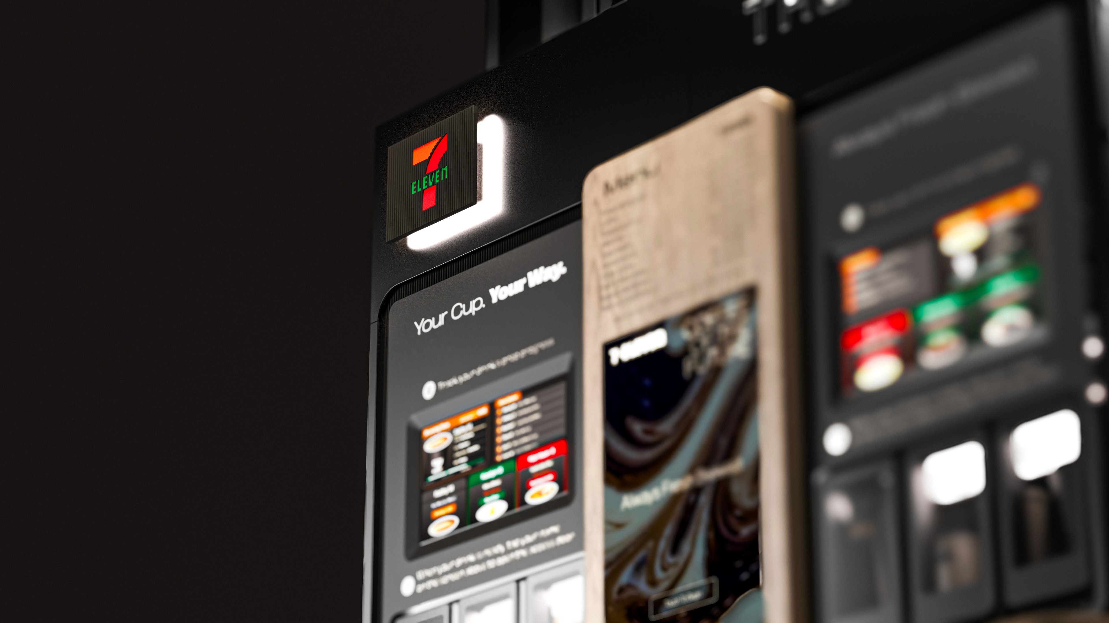 Monolithic Elegance: The machine’s seamless exterior blends metallic finishes with 7-Eleven’s signature colors, ensuring it feels both premium and familiar.