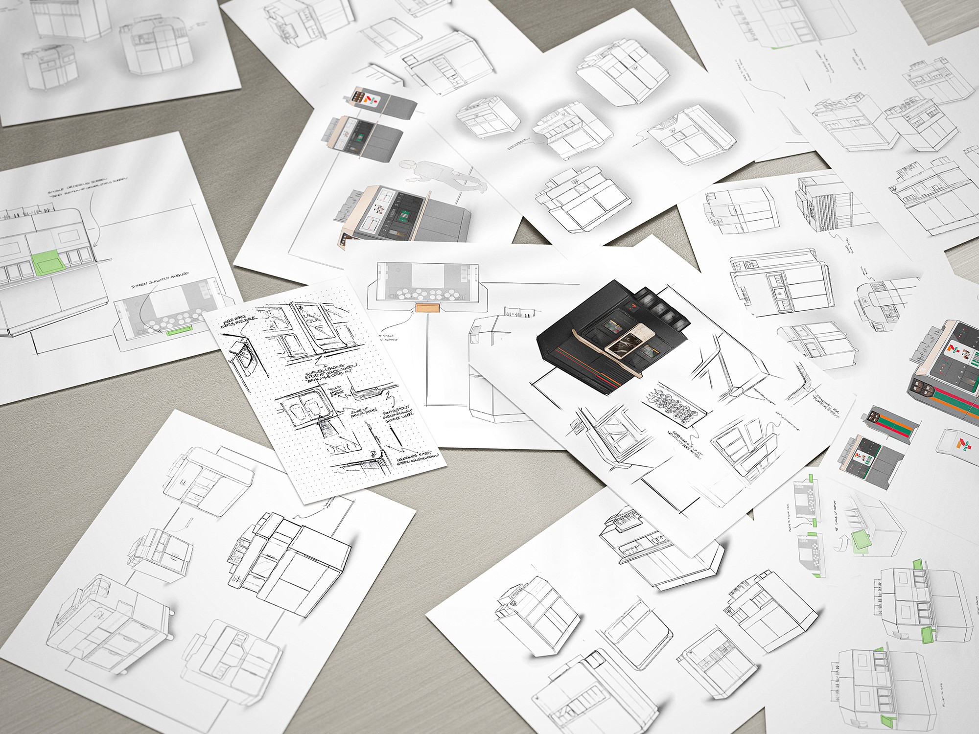 We developed the machine through multiple rounds of physical and digital iteration. On the industrial design side, early sketch work explored proportions, footprint, screen placements, and cup visibility. Shelf depths, door swing paths, and pickup ergonomics were tuned across pilots and internal reviews. These studies helped ensure the unit felt intuitive to approach and could accommodate multiple users interacting in parallel.