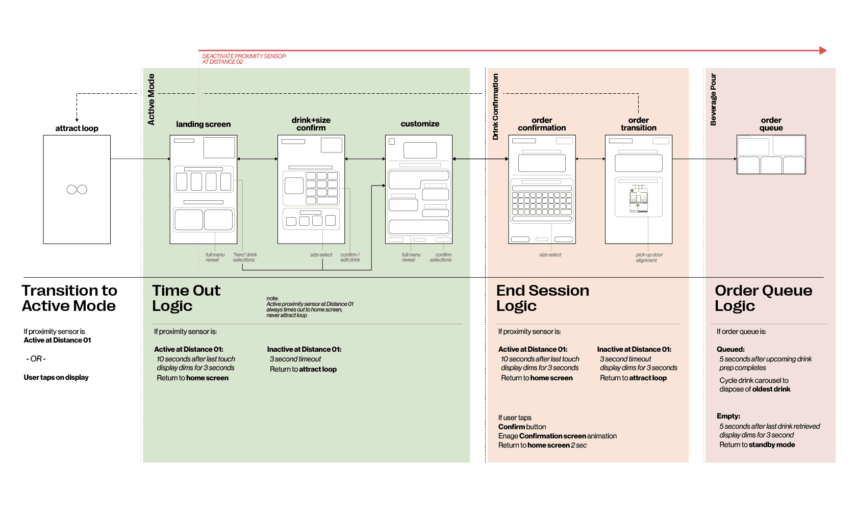 The user interface followed a similar trajectory—starting from static wireframes and evolving into full motion prototypes. Stakeholder feedback and field testing informed how progress was visualized, how door assignments were communicated, and how timeouts were handled if a user walked away mid-order. As new drink types were added—like nitro cold brew and seasonal mochas—we built out new paths and submenus without compromising clarity.