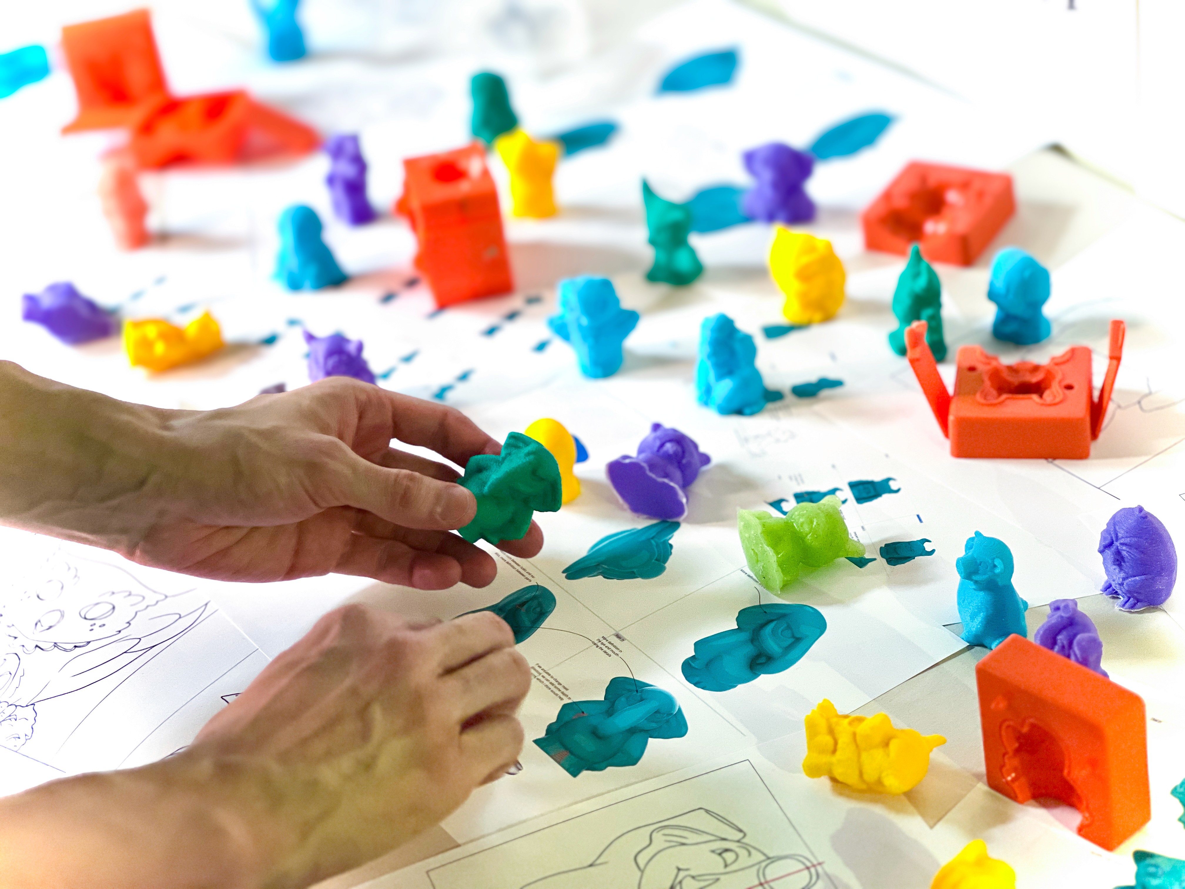 This live feedback loop let us resolve parting line strategy and moldability during the creative phase, not the engineering one. Instead of sculpting freely and hoping the character could be manufactured, we designed with the mold in mind from the start. Blender’s volume calculation tools also came into play, helping us keep each character within material limits and cure constraints tied to Elmer’s proprietary squishy compound.